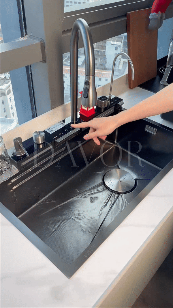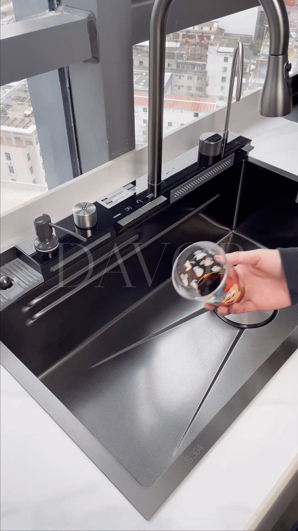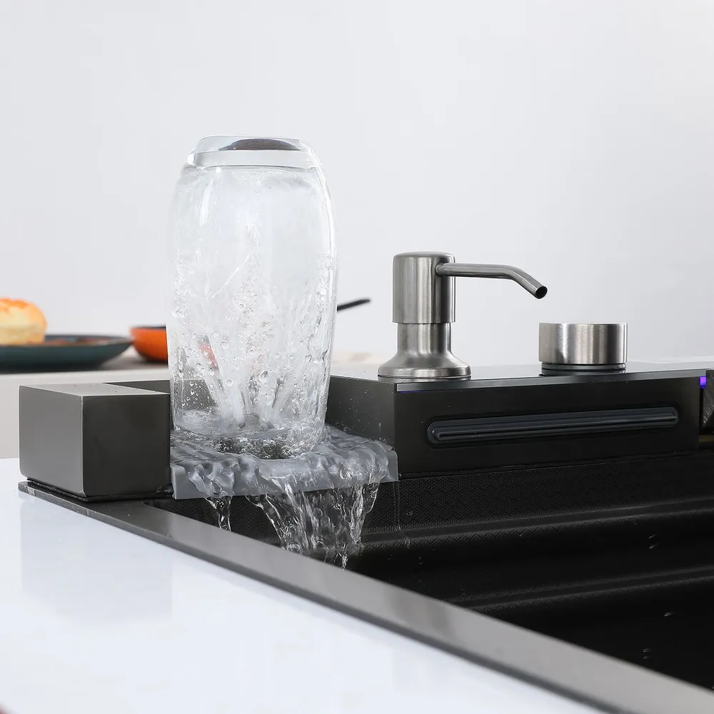 Featuring dual waterfall faucets, seamlessly switch between modes with the easy-to-use piano button. The sink comes complete with a convenient drain basket and metal tray, making cleaning quick and hassle-free.